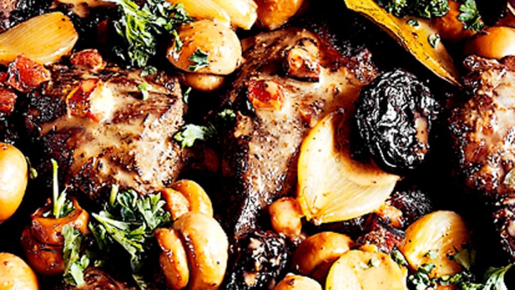 3. Paista herkkusienet voissa. Lisää ne ja luumut, kun pata on melkein valmis. Siivilöi liemi padasta kastikekasariin. Suurusta liemi kastikkeeksi kermaan sekoitetulla jauholla ja keitä 10 minuuttia. Kaada sitten takaisin pataan. Tarjoile.