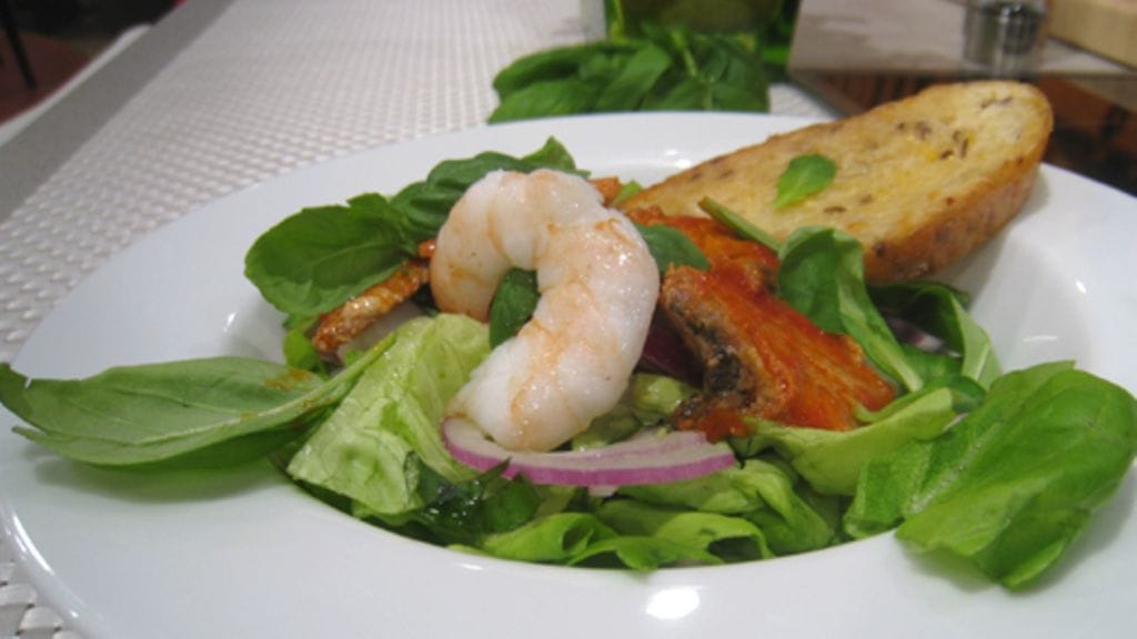 Asettele ravunpyrstöjä ja sardiineja salaatin päälle. Tarjoa salaatin kanssa tuoretta leipää.