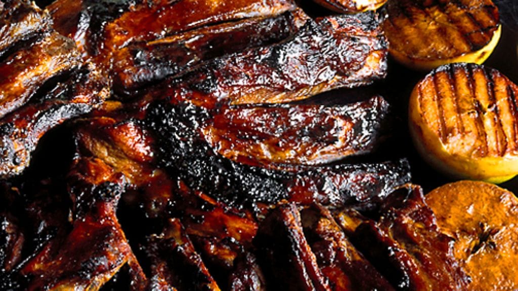 4. Laita uunipannu uunin keskitasolle n. 30 minuutiksi, joka lyhentää grillausaikaa. Penslaa uudestaan marinadilla ja grillaa hitaasti hiilloksella kunnes paisti on valmis. Grillatut omenaviipaleet ovat maukas lisuke.