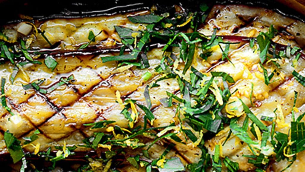 3. Sekoita öljy, sitruunamehu, suola ja pippuri. Penslaa jokainen viipale marinadilla ja laita kulhoon. Kaada loput marinadista päälle. Koristele sitruunankuorella ja persiljalla.