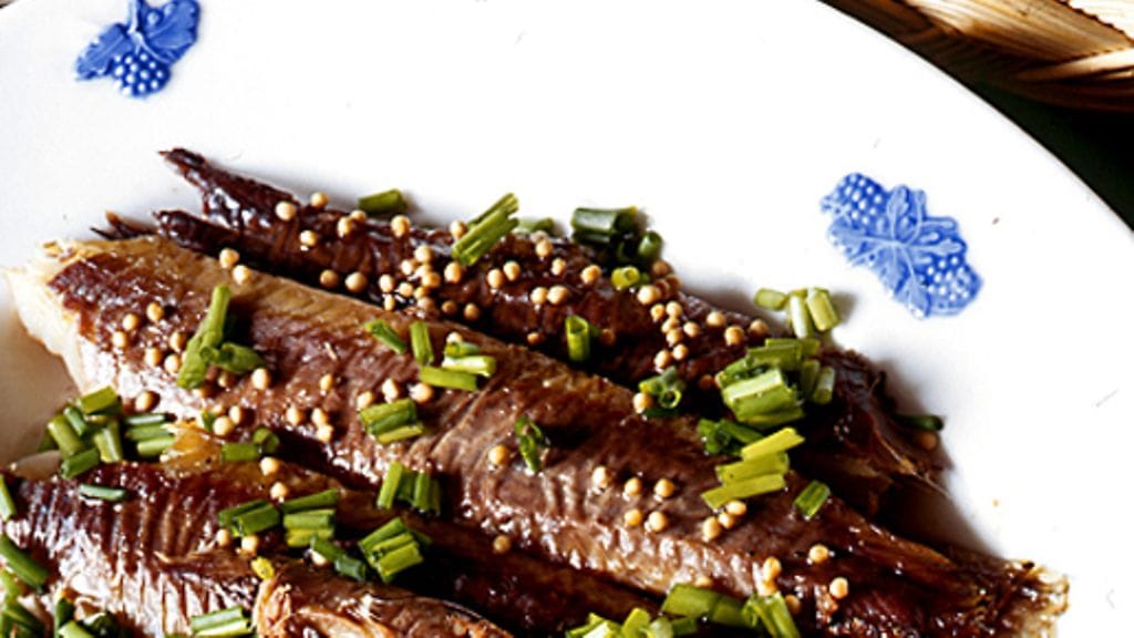 1. Kuumenna uuni 250 asteeseen. Perkaa savusilakat huolellisesti ja laita ne vadille. Ripottele päälle sinapinsiemeniä. Sekoita öljy, viinietikka, suola ja pippuri, kaada marinadi kalojen päälle. Koristele ruohosipulilla, anna silakoiden vetäytyä jääkaapissa.