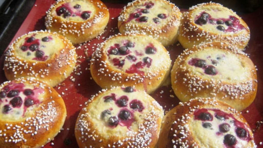Leikkaa taikinapalat kahtia ja anna kohota sellaisenaan tai pyörittele paloista pikkupullia normaaliin tapaan, kohota uudelleen kunnolla kaksinkertaisiksi lämpimässä paikassa liinan alla. Paina kohonneisiin pulliin keskelle juomalasin pohjalla syvennys. Voitele pullien reunat munalla, ripottele halutessasi raesokeria. Laita jokaisen pullan koloon pohjalle 1-2 tl sitrustahnaa ja täytä loppu kolo puhdistetuilla marjoilla. Sekoita loput aineet keskenään rahkaseokseksi ja jaa se marjojen päälle. Paista 200-asteisen uunin keskitasolla noin 10 minuuttia kauniin värisiksi.