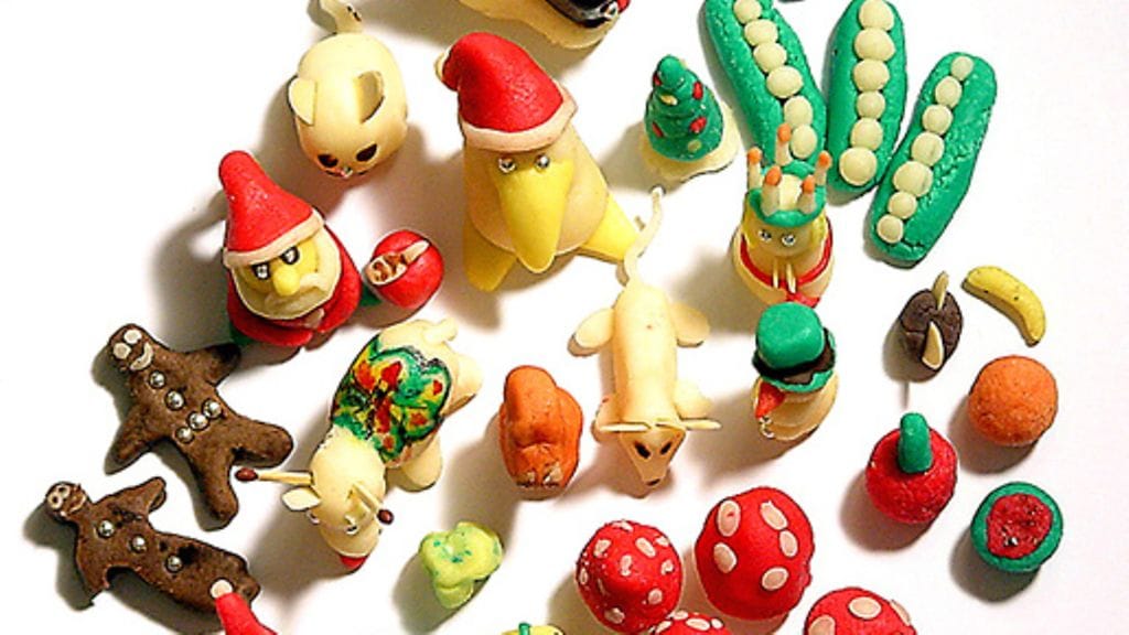3. Muotoile haluamasi hahmoja ja koristele. Valmiita makeisia voi säilyttää muovipurkissa huoneenlämmössä.