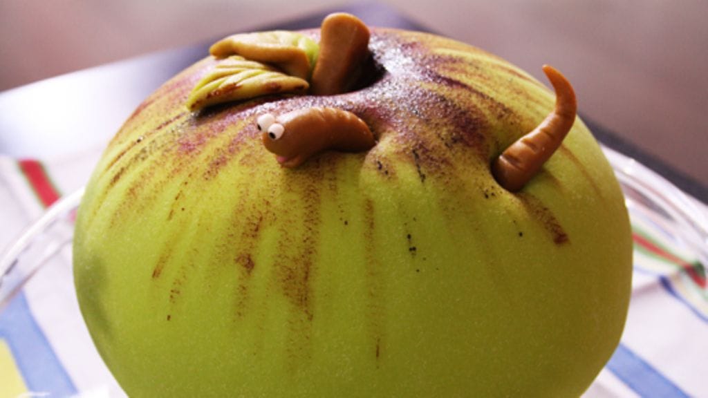 Kauli vihreä marsipaani ohueksi levyksi ja aseta kakun pintaan. Muotoile omenan malliseksi.