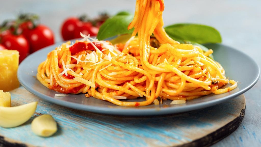 - Lisää isolle ja korkeareunaiselle pannulle pasta, tomaatit, sipuli, valkosipuli, chilihiutaleet, basilika, oliiviöljy, suola, mustapippuri ja vesi. Keittele korkealla lämmöllä välillä sekoittaen ja pastaa pihdeillä käännelle, kunnes pasta on lähes kypsää ja vesihaihtunut (noin 8-9 minuuttia)