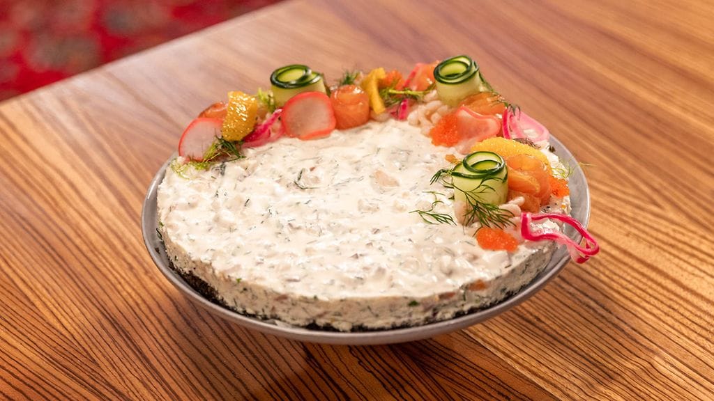 Kuutioi kylmäsavulohi, lisää ravut ja kaikki maitotuotteet kulhoon. Hienonna ruohosipulia ja tilliä ja punasipulia joukkoon. Mausta sitruunan mehulla, suolalla ja pippurilla. Lisää yhden appelsiininmehu kattilaan. Lisää 4 liivatelehteä kylmään veteen liukenemaan. Kiehauta appelsiinimehu ja lisää liivatelehdet appelsiinimehun joukkoon. Vispaa appelsiiniliivate voimakkaasti täytteen joukkoon. Kaada täyte pohjan päälle ja anna hyytyä jääkaapissa. Koristele kakku.
