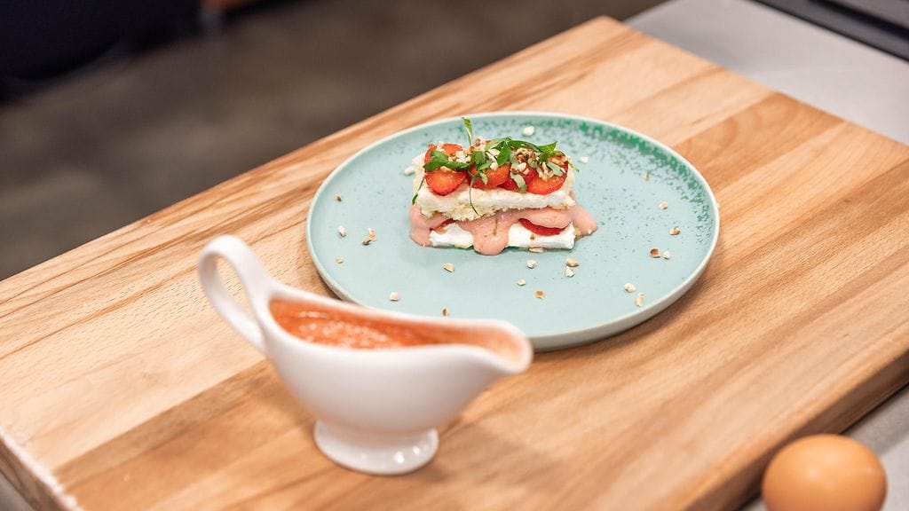 Laita kattilaan puolet mansikoista ja 1rkl sokeria. Keitä hetki, jotta mansikat pehmenevät. Jäähdytä kulhossa, lisää basilika ja loraus konjakkia. Aja tasaiseksi kastikkeeksi. Laita kastike kulhoon ja kylmään odottamaan tarjoilua.