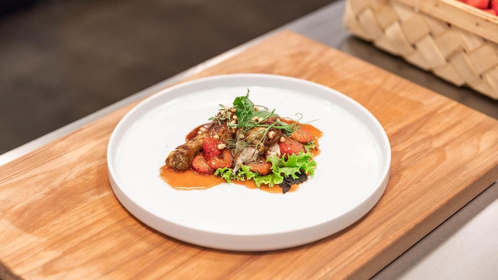 Purjo paistetaan voissa, mansikkaviipaleet grillataan kuumalla parilalla 5 min.