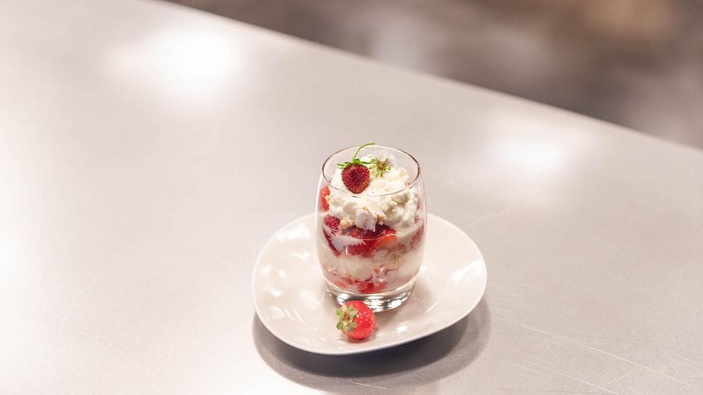 Aseta mansikat, vispikerma ja marenki kerroksittain esim. juomalaseihin.