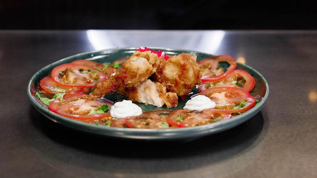 Sekoita puolikkaan appelsiinin mehu, ripaus suolaa ja mustapippuria sekä 2tl öljyä. Viipaloi tomaatit ohuiksi ja levitä lautaselle, nypi päälle mintun lehtiä ja kaada vinaegrette tomaattien päälle.