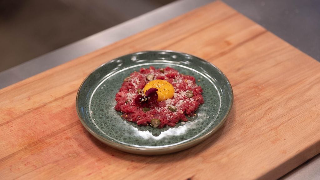 Leikkaa liha veitsellä pieniksi palasiksi. Mausta suolalla ja mustapippurilla.
