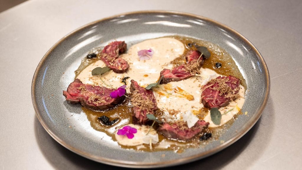 Suolaa liha ja paista nopeasti väriä pintaan. Anna vetäytyä ja leikkkaa ohuiksi siivuiksi.