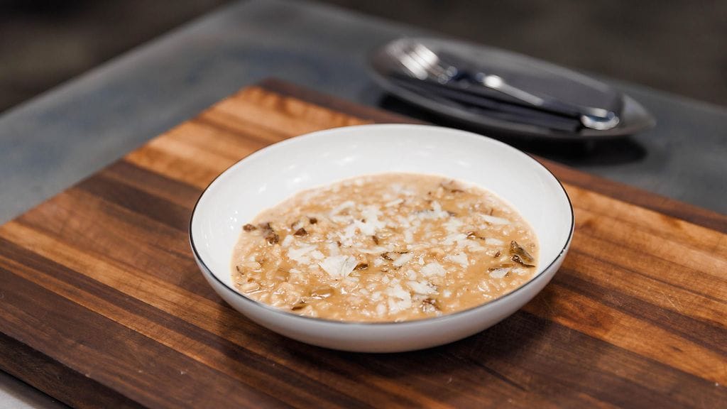 Pilko sipulit ja valkosipuli pieneksi. Kuullota öljyssä 2 minuuttia ja lisää riisit. Kuullota läpikuultavaksi. Lisää valkoviini ja sekoittele kunnes viini on imeytynyt. Lisää myös sienet pannulle ja kaada liotusvesi kanaliemen sekaan.