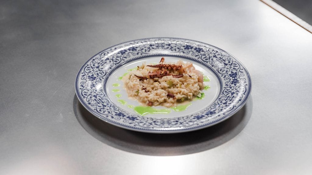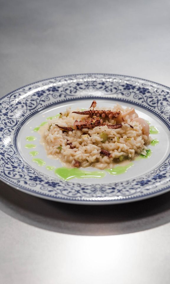 Paista kalmarit nopeasti pannulla valkosipulissa ja oliiviöljyssä. Mausta sitruunalla ja suolalla. Sekoita lopuksi kalmarit risoton sekaan. Koristele sitruunankuorella ja yrttiöljyllä.