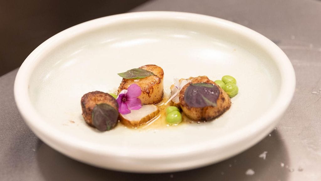 Kuivaa kampasimpukat ja paista voissa kuumalla pannulla, kunnes molemmilla puolilla on kaunis karamellisoitunut väri.