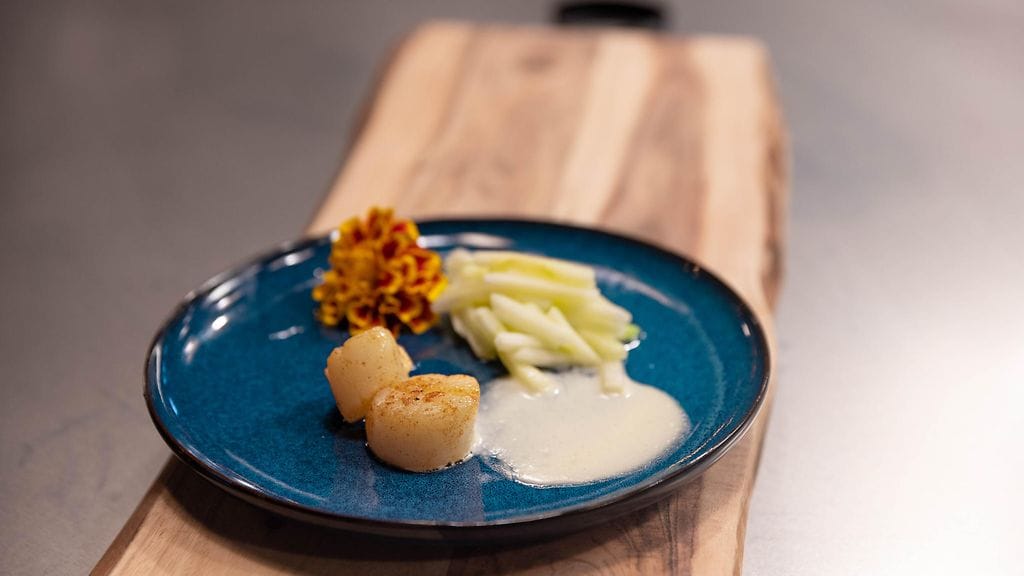 Valmista ensimmäisenä kampasimpukka kastike. Lämmitä paistinpannu, kuullota makea sipuli ja murskattu valkosipulin kynsi rypsiöljyssä. Lisää voi ja lämitä pannu pannu kuumaksi, lisää suola ja pipuri, paista kampasimpukat 1 min per puoli. Ota sivuun. Lisää korkeaan kulhoon kananmunan keltuaiset, kuohukerma, limetin mehut ja aja sauvasekoittimella sileäksi. Siivilöi kastike ja kaada sifoniin. Kastike tarjoillaan sifonissa ( 2 patruunaa).