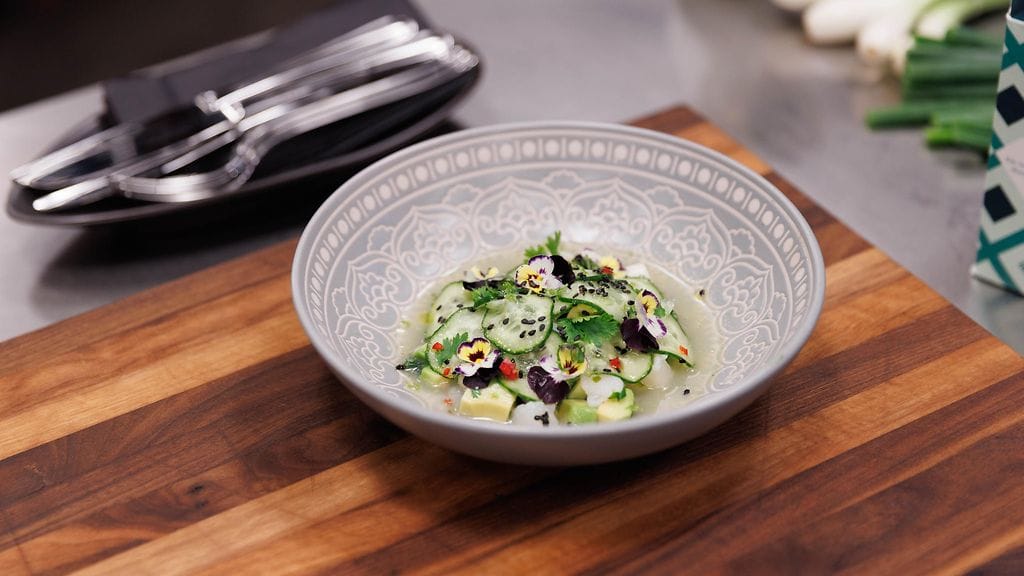 Asettele lautasen pohjalle ceviche ja laita kurkkusiivut cevichen päälle. koristele kukilla ja korianterin lehdillä.