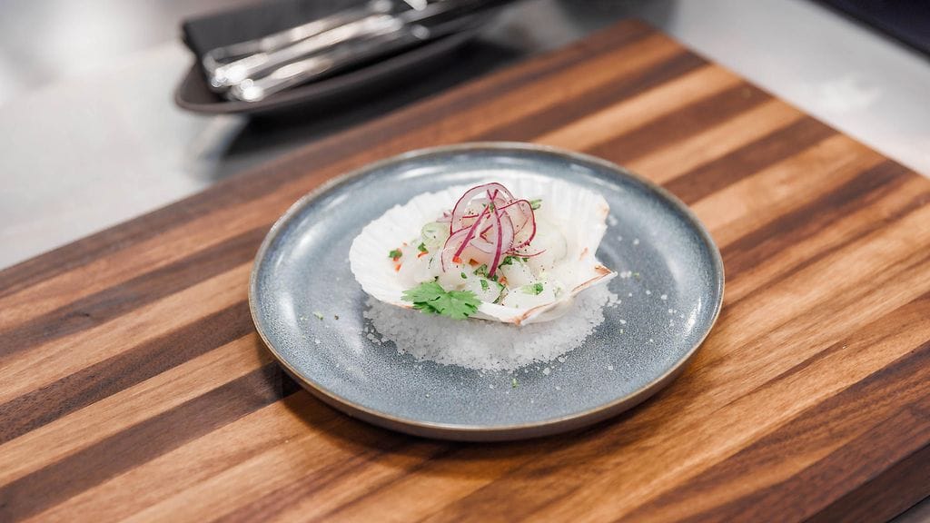 Kuutioi kampasimpukat. Laita simpukkakuutiot kulhoon ja mausta suolalla, limen mehulla ja limen kuorella. Hienonna valkosipuli, korianteri ja chili. Lisää ne simpukoiden joukkoon.