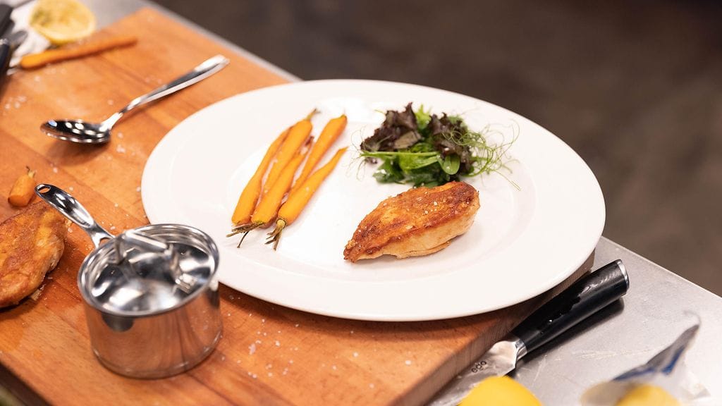 Leikkaa kanan rintafileet, paista nahka rapeaksi pannulla ja siirrä uuniin kunnen sisälämpötila 65- astetta. Anna vetäytyä ennen tarjoilua.