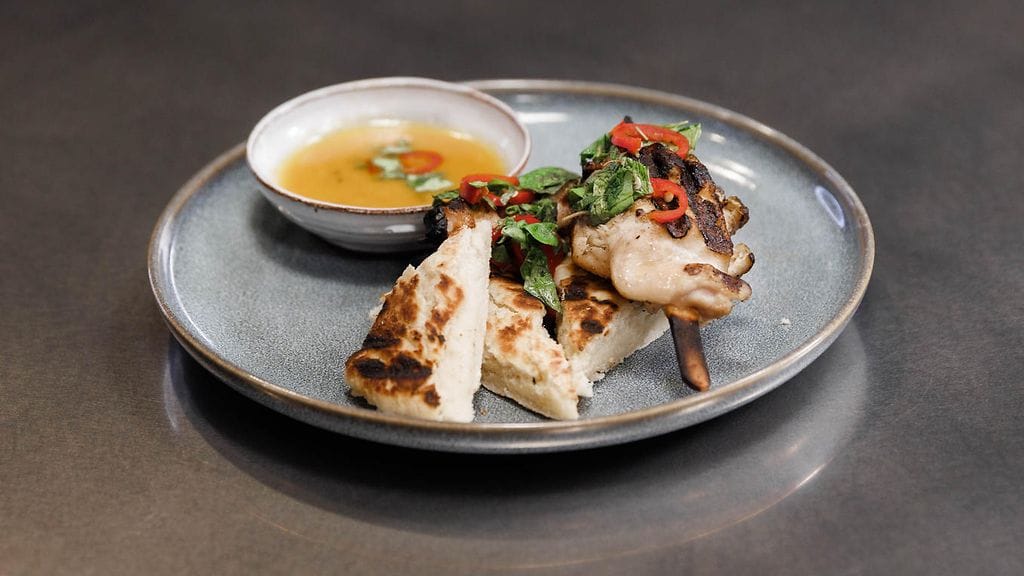 Soseuta kookoksen hedelmäliha sauvasekoittimella korkeareunaisessa kulhossa, lisää tarvittaessa seokseen vettä. Lisää kookosseokseen 1 teelusikallinen leivinjauhetta, noin 2dl vehnäjauhoja ja 1 tl suolaa ja noin 25g voita. Muotoile taikinasta ohuita pyöreitä leipiä ja paista kuumalla kuivalla pannulla molemmin puolin noin 2 minuuttia.