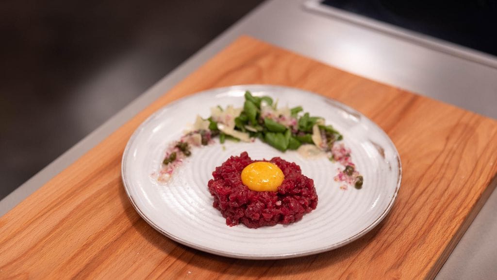 Aseta liha lautaselle ja tee kolo keltuaista varten. Erottele keltuainen ja aseta lihan päälle.