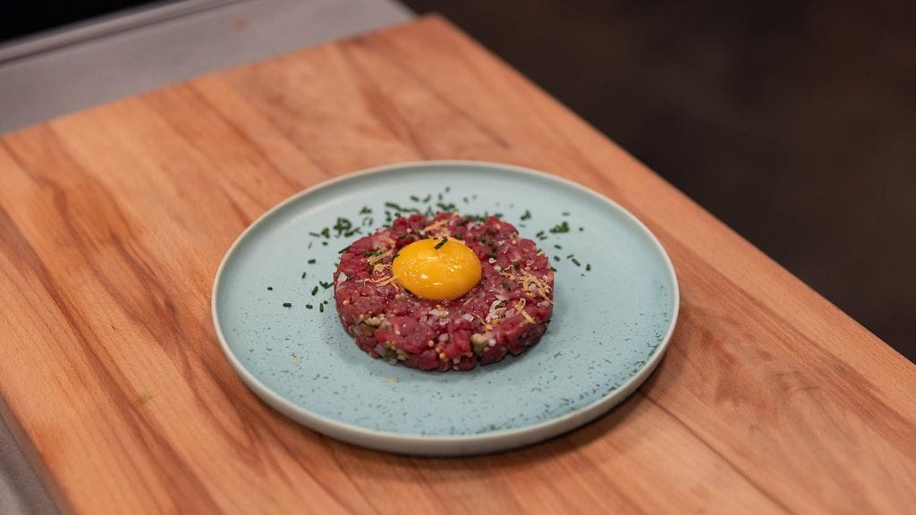 Muodosta lihamassa pyöreäksi kiekoksi lautaselle ja tee keskelle pieni syvennys. Erittele kananmuna ja laita keltuainen lihamassan päälle