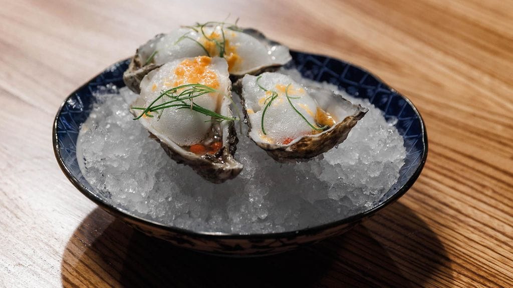 Siivilöi merilevä pois liemestä ja laita liemi jäähtymään vatkausta varten, liemen tulee olla kylmää vaahdon tekemiseen. Tässä vaiheessa voit avata osterit ja putsata ne. Siirrä osterit kylmään odottamaan. Kun liemi on jäähtynyt, laita liivatteet kylmään veteen pehmenemään. Sulata liivatteet tilkassa vettä tai kombuliemessä, laita liemi mittakulhoon ja kaada liivate päälle. Aja sauvasekoittimella vaahdoksi. Kokoa annos jääpedille. Lusikoi jokaisen osterin päälle mignonettea, tyrni-lakka melbaa, ruokalusikallinen merivesivaahtoa ja raasta päälle granitaa. Koristele vielä lopuksi meriruoholla.
