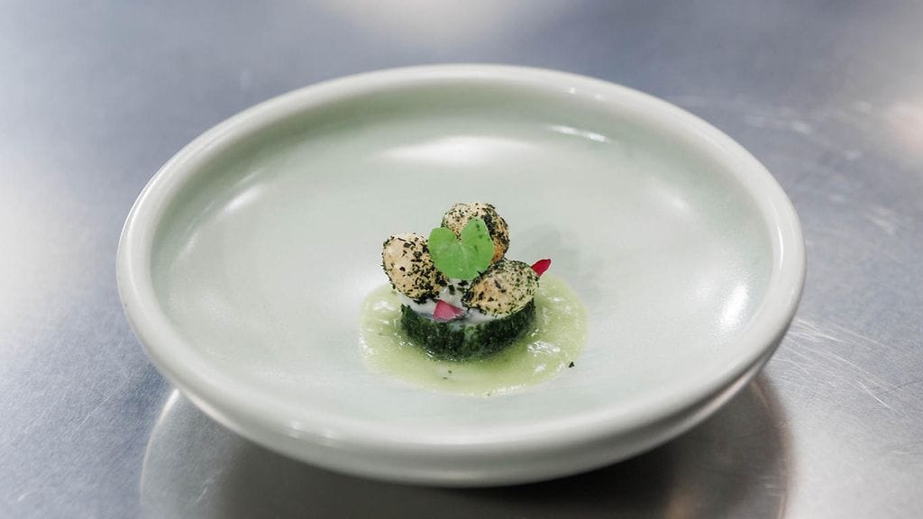 Mittaa 40g valkuaista, 60g turkkilaista jogurttia, 10g riisiviinietikkaa, 4g suolaa, 150g neutraalin makuista öljyä sauvasekoitinkulhoon ja emulsoi. Raasta mukaan sitruunan kuorta ja laita jogurtti dressing pursotinpussiin. Siirrä kylmään odottamaan.