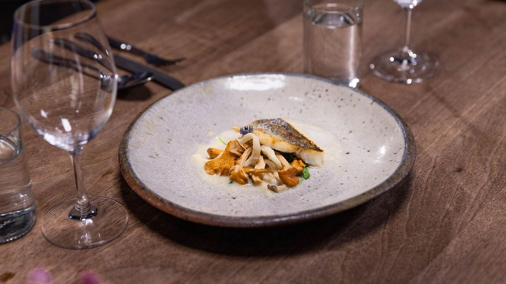 Annostele lautaselle pinaatti, sienet ja kala sekä kastike.