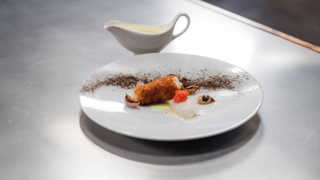 KUHACONFIT: Laita kuhafileet, ruskistettu voi ja yrtit vakuumiin. Kypsennä kuhafileet sousvidessä 45 asteessa.