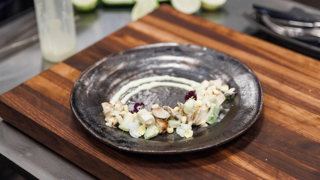 Sekoita tiikerinmaito ja kuutioidut raaka-aineet sekä maissi keskenään kulhossa. Tarkista suola ja happo ja lisää tarvittaessa suolaa sekä limenmehua.