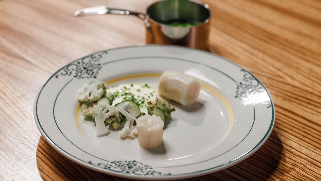 Pilko shalotti- ja valkosipuli ja kuullota niitä voissa. Lisää valkoviini ja keitä noin puoleen, lisää kalaliemi ja keitä taas puoleen. Lisää kerma ja keitä jälleen puoleen. Mausta mesiangervolla ja suolalla.