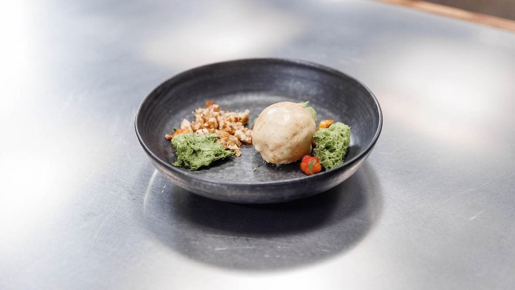 Valkosuklaa pallo. Sisin kerros: Kuumenna lakka ja vesi, sekoita tasaiseksi sauvasekottimella. Siivilöi ja jäädytä puolipallo muottiin. Keskikerros: Liota liivatteet, punnitse maito kattilaan ja sulata suklaa. Vispaa kerma valmiiksi jääkaappiin. Lämmitä maito ja liota liivatteet. Kaada suklaaseen ja sekoita tasaiseksi. Kaada seos noin 45 asteeseen vatkatun kerman sekaan ja sekoita. Kaada muotin pohjalle ja lisää jäätynyt lakka puolipallo. Laita pallon yläosa kiinni, ja pursota loput mousset sisään. Pakasta noin 1 h. Kun jäätynyt, sulata suklaa ja kaakao voi, dippaa pallo seokseen ja viimeistele kultajauheella.