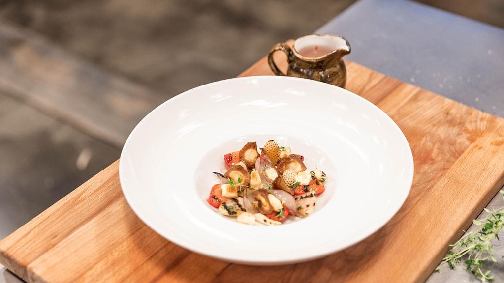 Leikkaa kevätsipulien vaaleat osat ja grillaa ne niin, että niihin jää kauniit jäljet parilasta. Itse sipuli saa jäädä hieman raa’aksi. Leikkaa viistosti ja jätä lepäämään. Mausta suolalla.