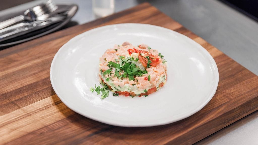 Annostele stanssin avulla lautaselle komponentit kerroksittain. Jätä lohi päällimmäiseksi
