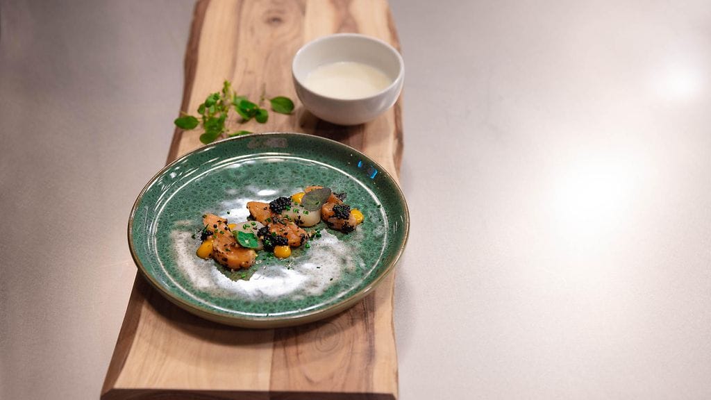 Paista tulikuumalla pannulla lohi noin 10 sekuntia per puoli. Pyörittelen lohi inkivääriglaseerauksessa ja sen jälkeen furikakessa.