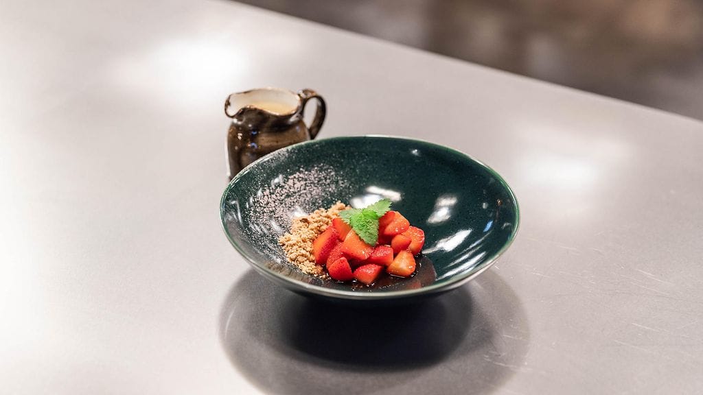 Aseta lautasen keskelle mansikat, reunalle mantelimurua ja mansikkapölyä. Kaada kastike marjojen päälle tarjoillessasi annoksen.