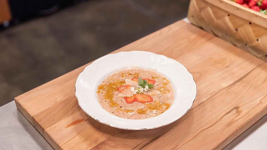 Survo mansikat teho- tai sauvasekoittimella. Mausta suolalla ja pippurilla ja siivilöi.
