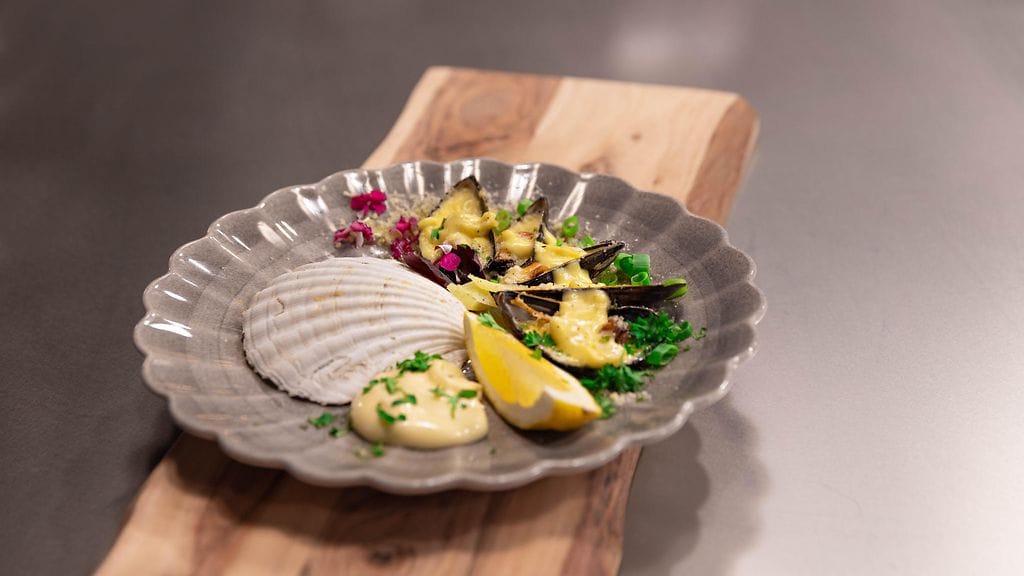 Simpukat keitetään 5 minuuttia valkoviini-voi seoksessa. Asetetaan lautaselle, saa hieman jäähtyä.
