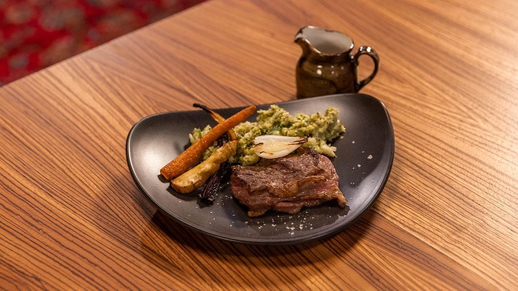 Ota sipuli pois lihan rasvapannulta ja lisää osa kasvismuusin sekaan, loput liemestä annoskulhoon. Paista liha kuumalla pannulla molemmin puolin että liha saa todella tumman pinna, jätä liha roseeksi sisältä. Kokoa annos.