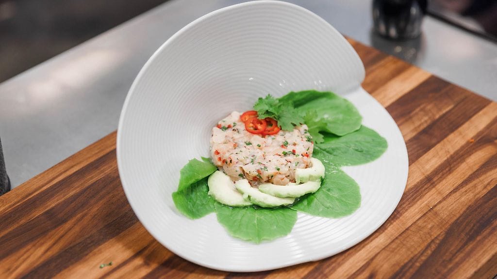 Sekoita kaikki ainekset ja tarjoile salaatinlehtien ja avokadon kera n. 2 minuutin päästä, älä anna kypsyä liikaa!
