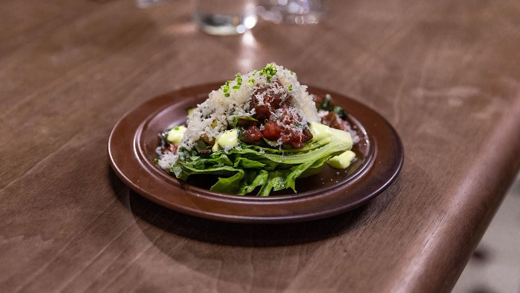 Laita lautaselle grillattu sydänsalaatti ja lisää hieman hapanolutta päälle. Lusikoi päälle panzanella-salaattia ja raasta päälle lopuksi juustoa.