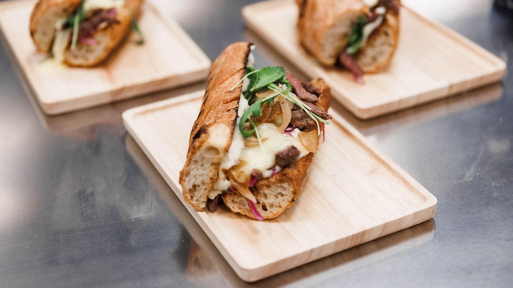 Leikkaa patonki kolmeen yhtä suureen osaan. Paahda leipiin pannulla rapea pinta.