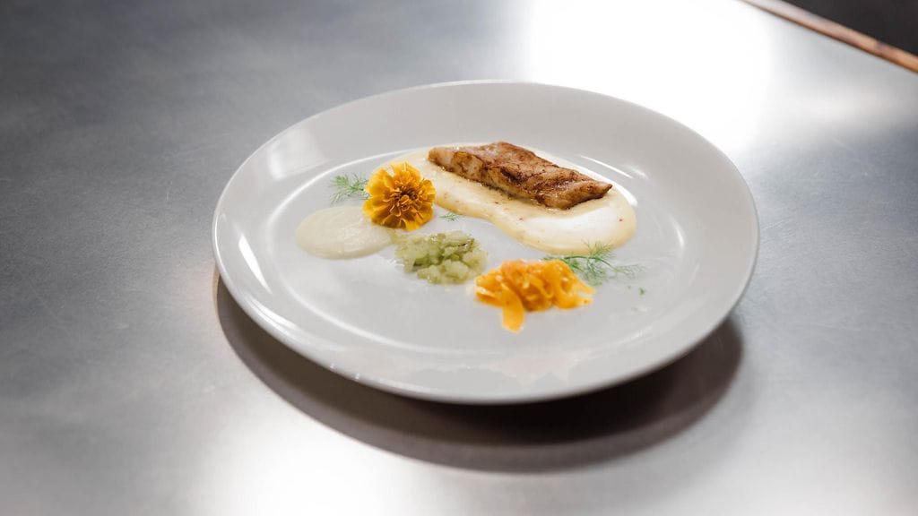 Kuori ja pilko salottisipulit. Kuullota kattilassa sipulit, fenkolipalat, pilkottu peruna ja lisää loraus valkoviini, suolaa ja vettä. Keitä kypsiksi ja kaada ylimääräinen liemi pois. Lisää iso nokare voita ja hunaja. Aja pyreeksi tehosekoittimessa.