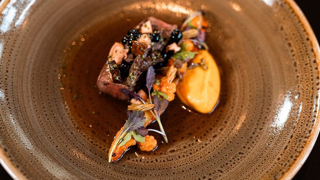 Laita vesi kiehumaan porkkanapyreen porkkanoita varten. Laita kattilaan redusoitumaan kanalientä ja riistalientä. Lisää liemeen kuivattuja sieniä, paahdettua sipulia, porkkanaa ja tähtianista sekä variksenmarjaa. Laita toiseen kattilaan redusoitumaan valkoviini, punaviini sekä punaviinietikka.