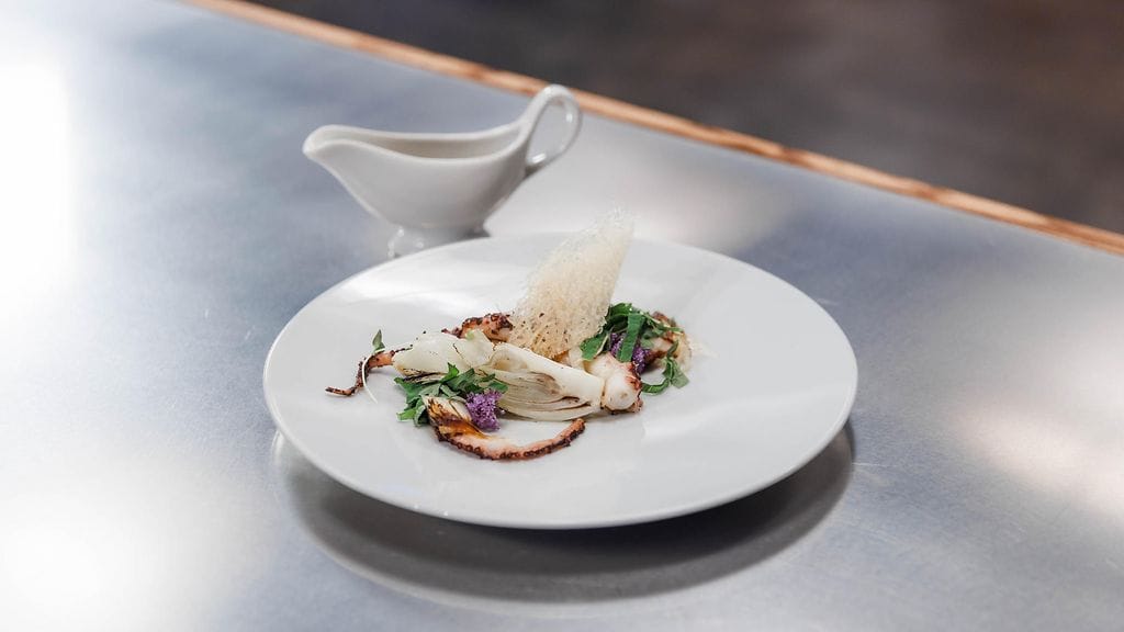 Aloita laittamalla painekattila puolilleen vettä. Lisää liemen mausteet eli laakerinlehti, tähtianis, kuorittu shalottisipuli, puolikas valkosipuli nippu, vaniljatanko ja kourallinen timjamia sekä suola. Pese mustekala ja leikkaa silmien alta saksilla pää pois. Ota nokka pois ja lisää se painekattilaan n.25 minuutiksi.