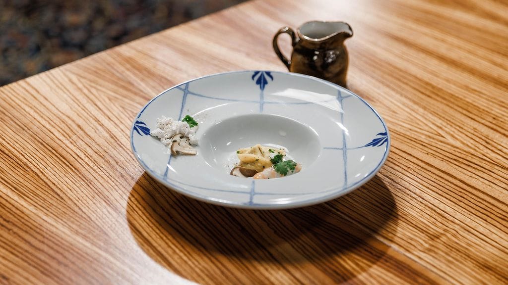 Valmista tortellinien täytte hauduttamalla 120 g shimejiä creme fraichessa ja aja pyreeksi tehosekoittimessa. Mausta batak-pippurilla ja täytä tortellinit. Lämmitä rapsiöljyä 65 asteiseksi ja kaada joukkoon 1 rkl batak-pippureita. Hauduta 15 min ja siivilöi öljy.