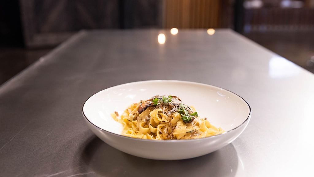 Valmista pasta. Sekoita ainekset. Laita vakuumiin 15 min. Tee tagliatelle