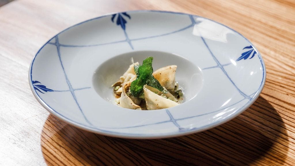 7. Koristele pistaasipähkinöillä ja friteeratuilla salvian lehdillä.