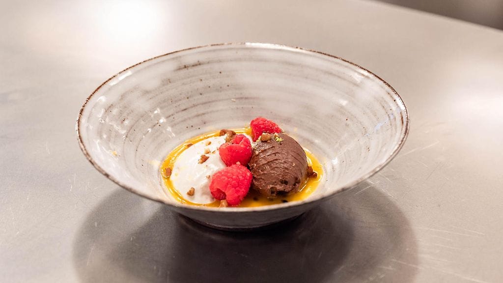 4. Kokoa annos lautaselle ja lisää päälle tuoreita vadelmia ja pekaanipähkinämurua.